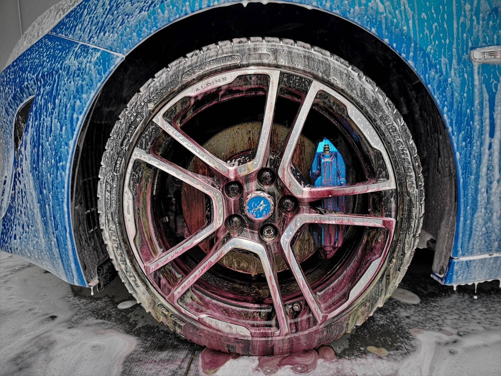 Durant le processus de préparation nous avons effectué un lavage intégral de l'Alpine A110 suivi d'une décontamination chimique et mécanique des jantes et de la carrosserie.