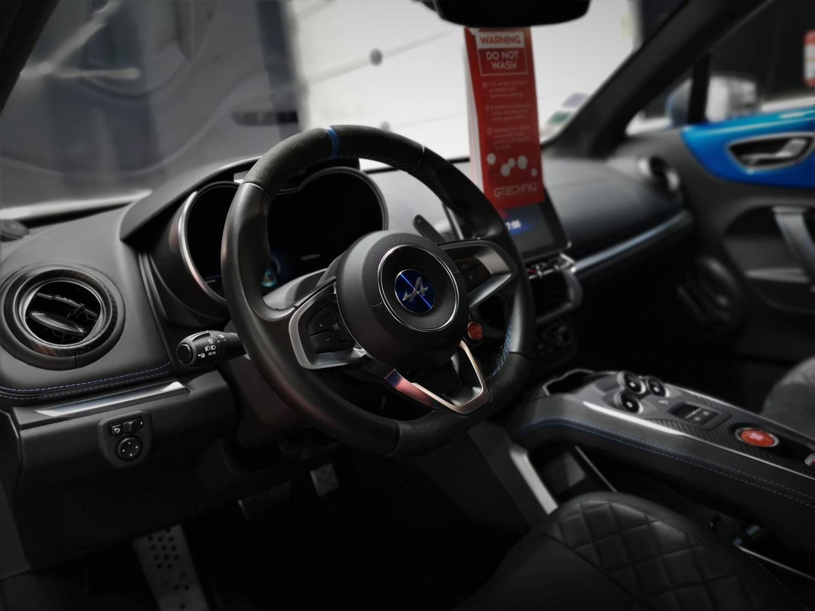 L'habitacle de cette nouvelle ALPINE A110 a bénéficié d'un traitement Biocote de nettoyage au "Tri-Clean" Gtechniq pour maintenir une propreté optimale des cuirs et tissus alcantara.