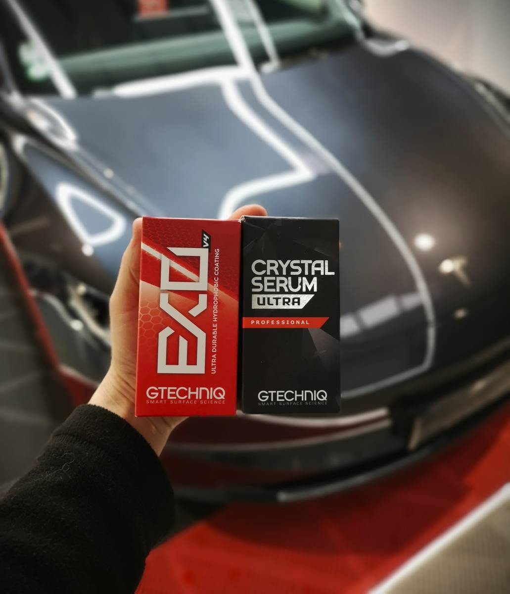 Ensuite, un traitement céramique très durable a été posé pour conserver l'état obtenu et la protéger contre les agressions du temps pendant 9 années grâce à Gtechniq "Crystal Sérum Ultra". Un traitement Top Coat céramique "EXOv5" a aussi été appliqué pour ainsi apporter encore plus d'hydrophobie aux surfaces peintes et éviter toute adhésions des contaminants et saletés.